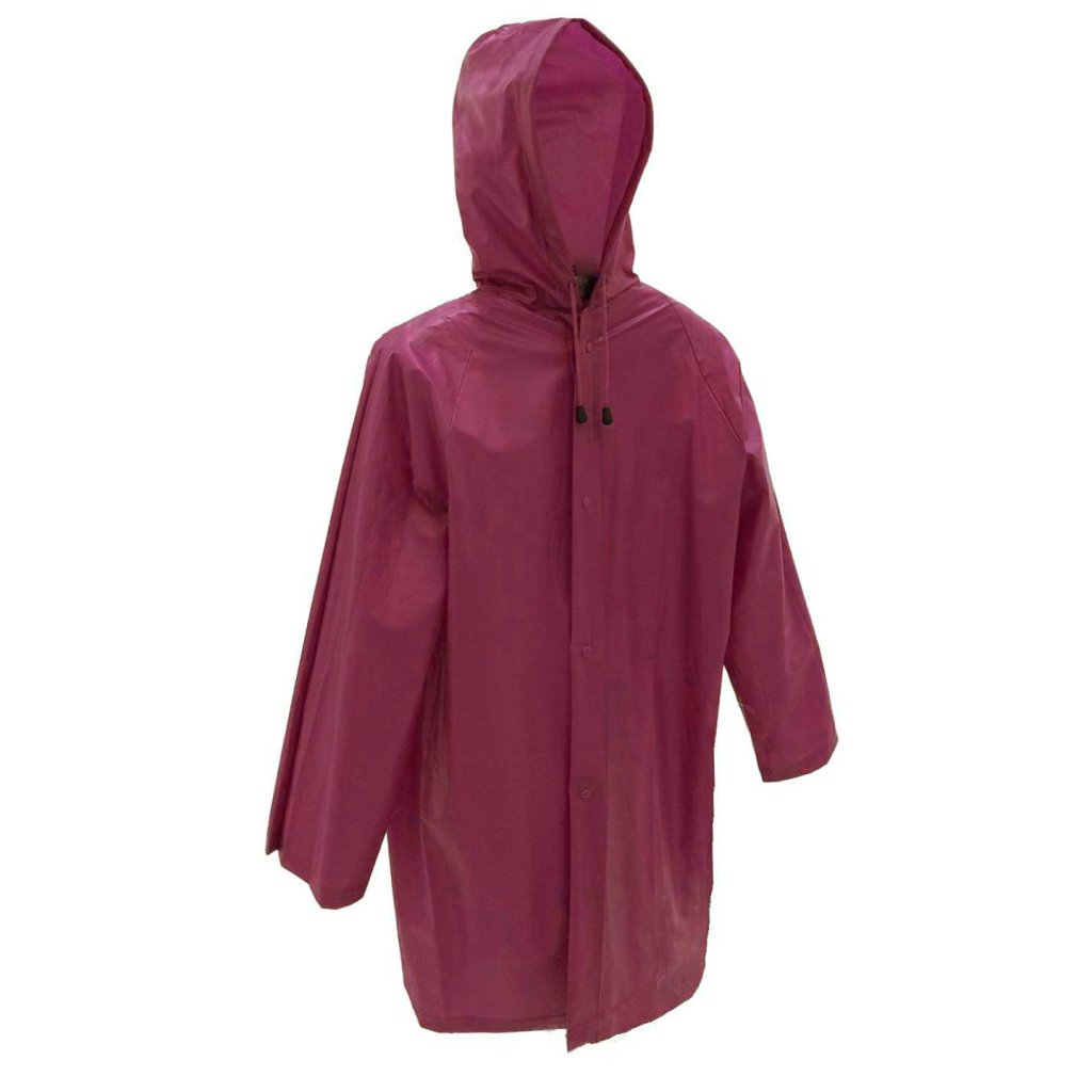 Płaszcz przeciwdeszczowy dla dorosłych w kolorze wina z kapturem i zatrzaskami. Płaszcz jest kompaktowy, odpowiedni na wycieczki i codzienne noszenie do miasta. Solidny wytrzymały materiał w porównaniu do "zwykłych" płaszczy, nie podrze się tak łatwo.