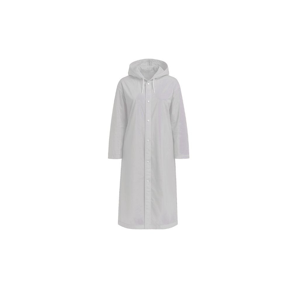 Uniwersalny płaszcz przeciwdeszczowy dla dorosłych w kolorze białym z kapturem i zatrzaskami. Płaszcz przeciwdeszczowy jest kompaktowy i nadaje się na wycieczki oraz do codziennego noszenia w mieście.