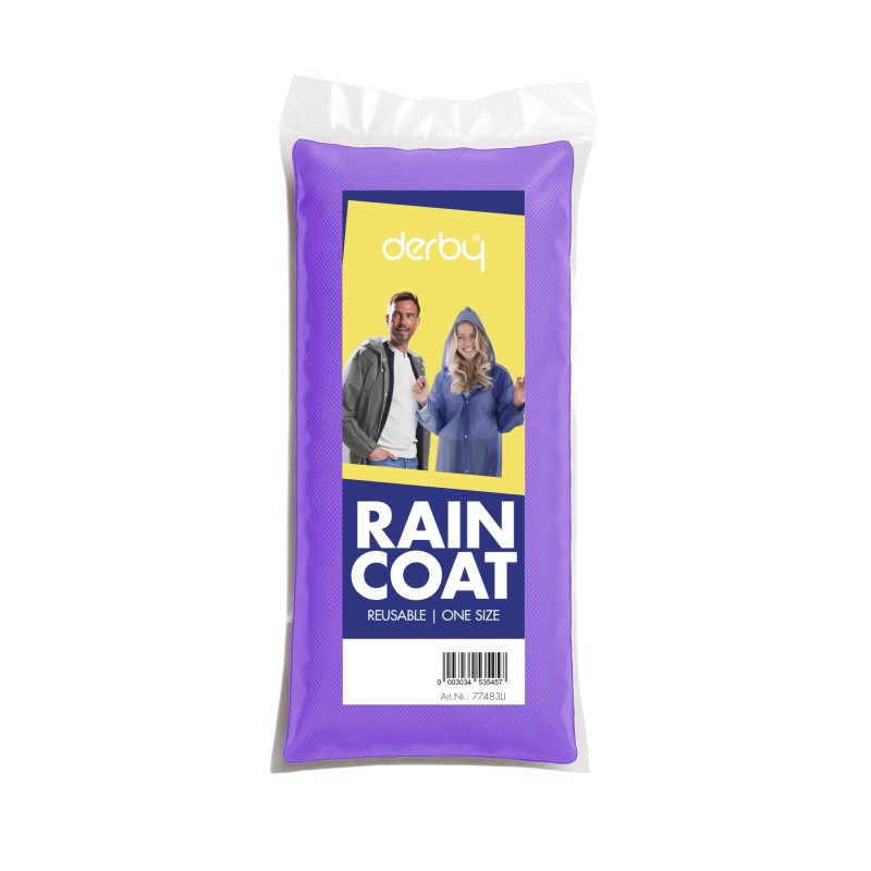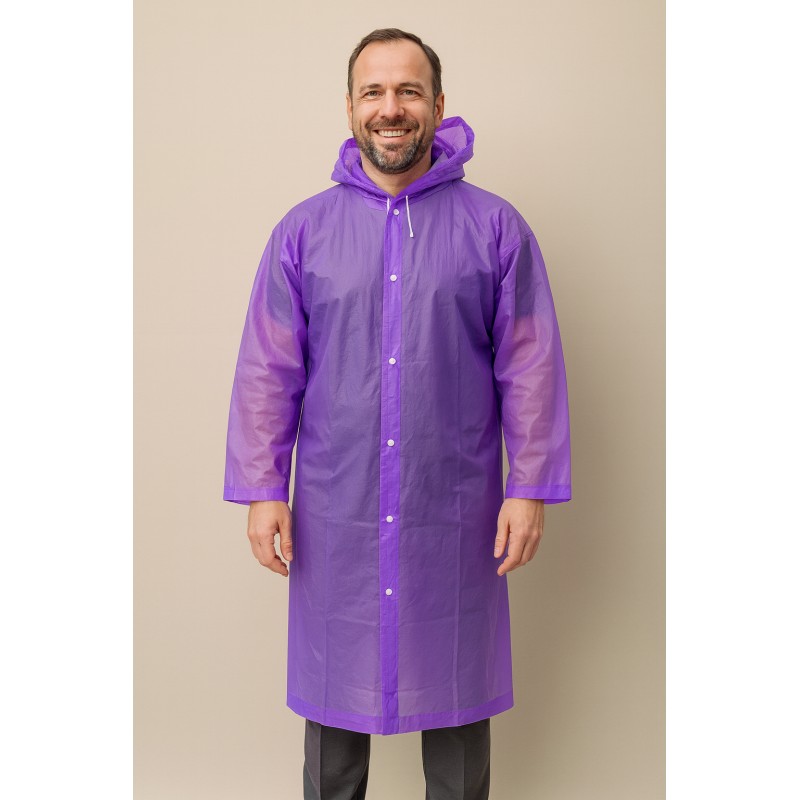 Uniwersalny płaszcz przeciwdeszczowy dla dorosłych w kolorze fioletowym z kapturem i zatrzaskami. Płaszcz jest składany i nadaje się na wycieczki i do noszenia na co dzień w mieście. Wykonany jest z materiału PEVA - skrót od octanu polietylenu winylu (angielski Polyethylene Vinyl Acetate). Jest to tworzywo sztuczne, które jest często stosowane jako bardziej przyjazny dla środowiska zamiennik PVC, ponieważ nie zawiera chloru, ftalanów ani innych szkodliwych substancji.