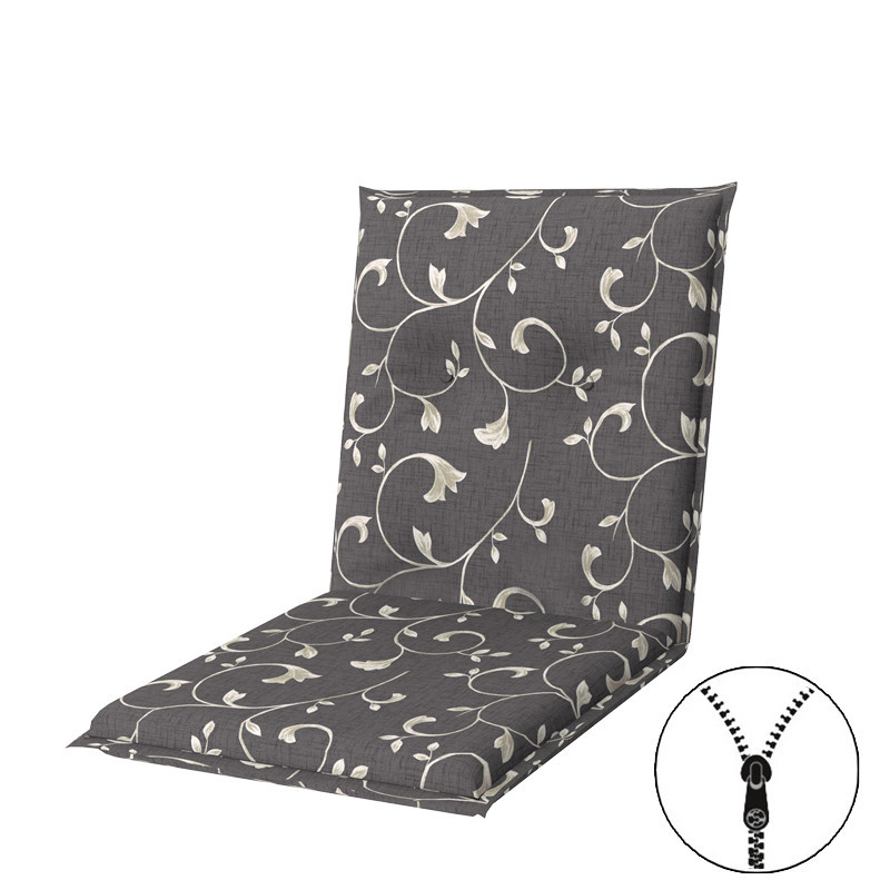 Poduszka z niskim oparciem do mebli ogrodowych z serii LIVING w wersji z obszytym brzegiem, bez przeszycia w oparciu. Mocowanie odbywa się za pomocą przesuwanej klamry. Dzięki klamrze można dopasować rozmiar do wielkości i rodzaju krzesła, klamra jest zamocowana na stałe i nie wysuwa się. Poduszka siedziska jest mocowana za pomocą dwóch sznurowadeł w zagięciu poduszki. Poduszka jest zapinana na zamek błyskawiczny, czasza parasola jest zdejmowany i można go prać .