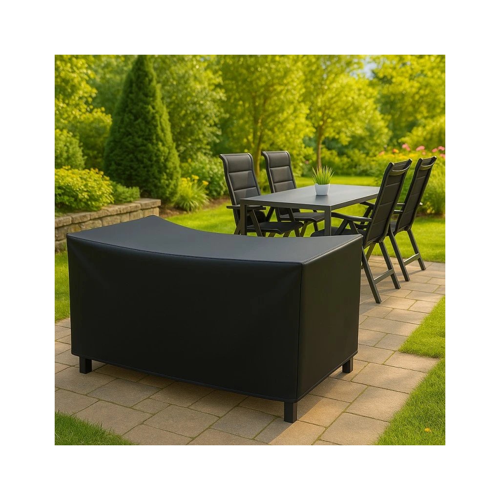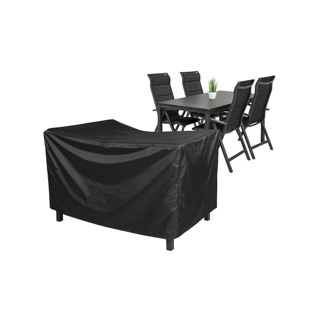 Wytrzymała plandeka ochronna z wysokiej jakości poliestru ochroni Twój mebel przed światłem, deszczem i brudem oraz znacznie przedłuży jego żywotność. Przed użyciem krzesła, jeśli to możliwe, złóż je, ustaw poszczególne meble jak najbliżej siebie i przykryj pokrowcem. Aby zapewnić lepszy odpływ wody deszczowej, zalecamy umieszczenie między stołem a pokrowcem np. wiadra, tak aby powstała podwyższona przestrzeń i woda mogła swobodnie spływać po bokach. Dla lepszego mocowania podczas wietrznej pogody, w rogach plandeki znajdują się oczka z linkami do mocowania do mebli. Pokrowiec ochronny jest również idealny do użytku podczas zimowania.