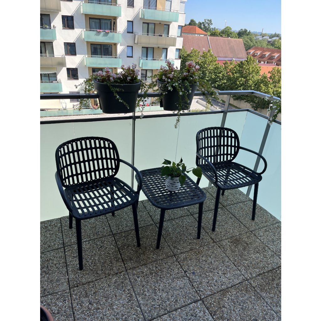 Praktyczny plastikowy zestaw POLIKORO będzie wspaniałym dodatkiem na Twój balkon, loggię lub mniejszy taras. Dużą zaletą zestawu jest łatwa konserwacja dzięki polipropylenowi, z którego wykonany jest cały zestaw. Polipropylen jest odporny na promieniowanie UV i warunki atmosferyczne. Zestaw ma solidne i stabilne wykonanie w kolorze czarnym.