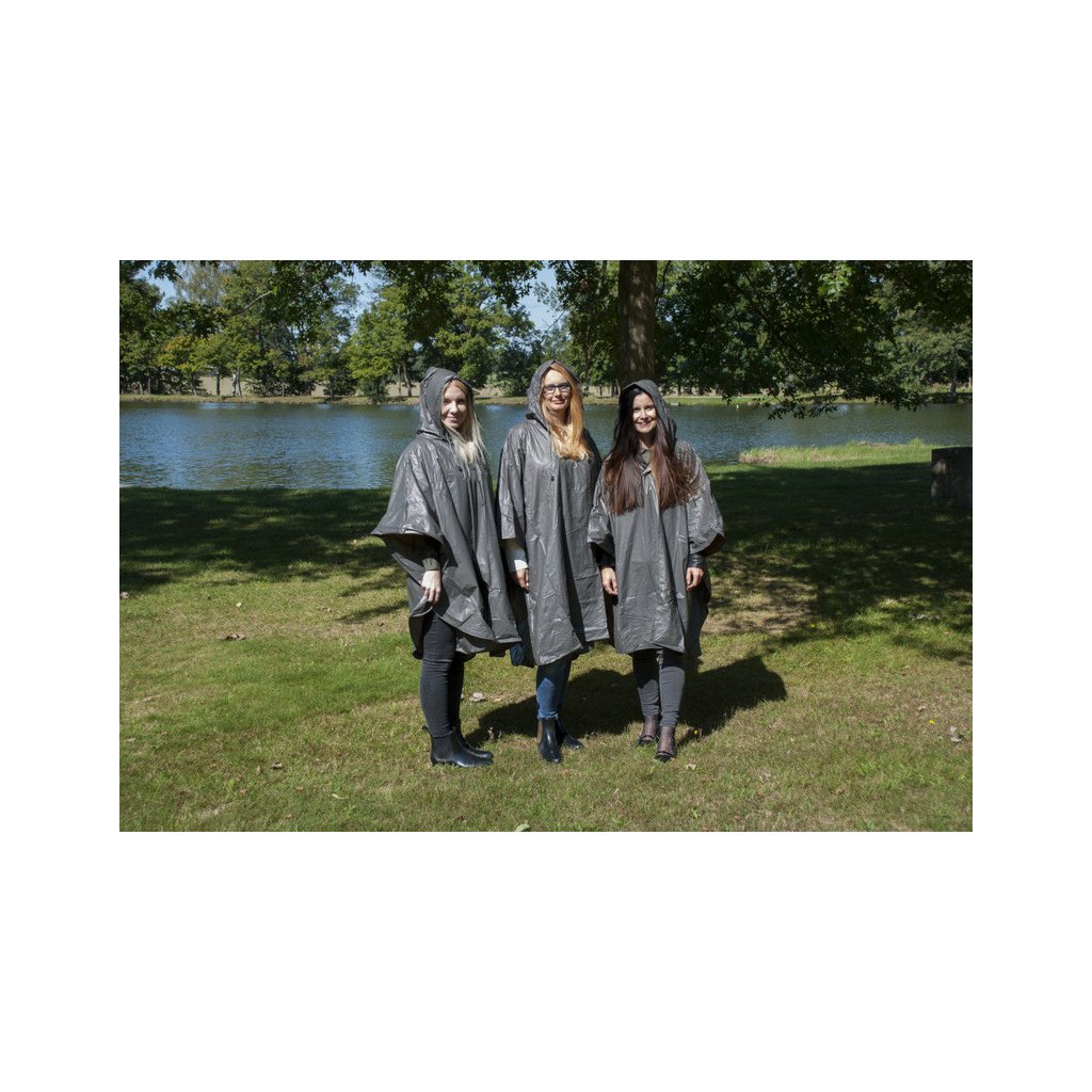 Ponczo dla dorosłych w kolorze szarym ze sznurkiem do ściągania kaptura i zatrzaskami przy szyi. Zatrzaski pod rękawami. Ponczo jest poręczne, odpowiednie na wycieczki i codzienne noszenie do miasta.
