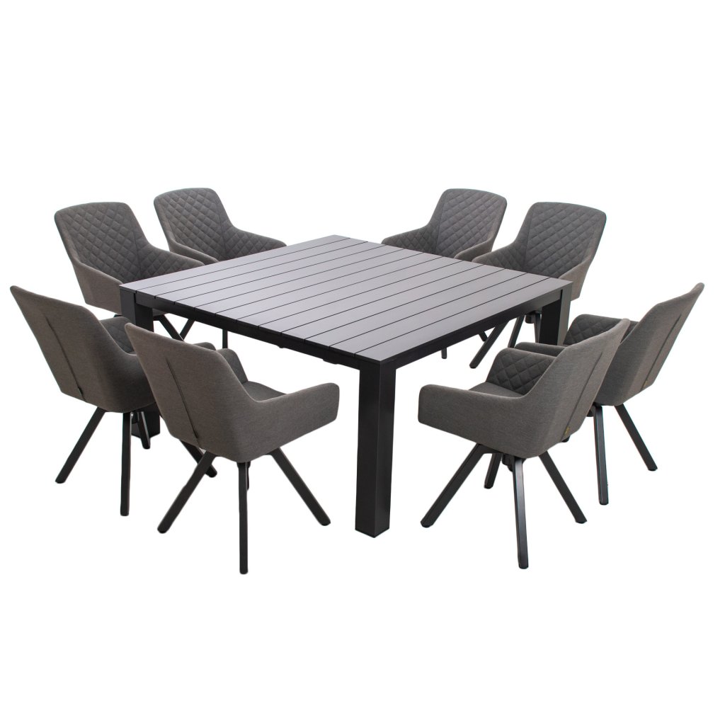Ten luksusowy zestaw jest idealny dla każdego, kto szuka eleganckich mebli o wyjątkowej odporności na warunki atmosferyczne. Zestaw składa się z 8 obrotowych foteli i dużego, kwadratowego stołu aluminiowego.