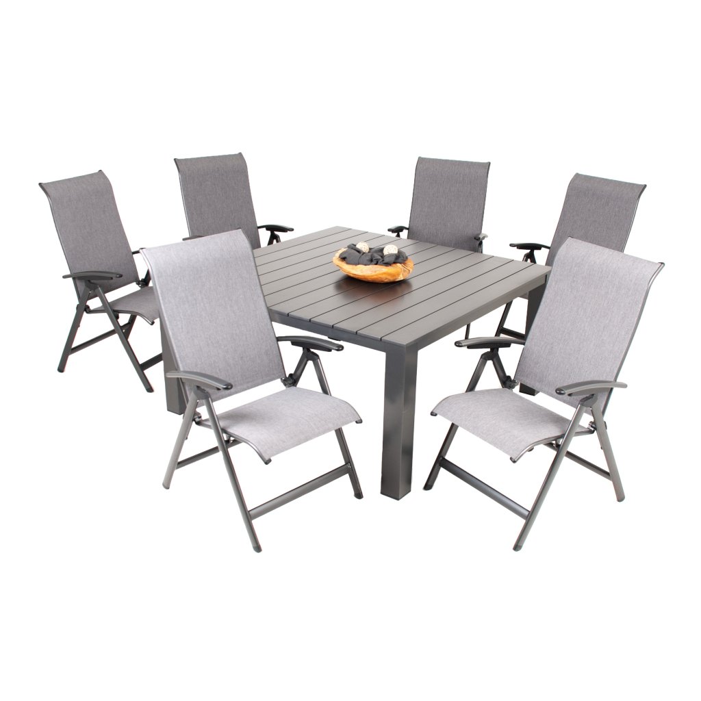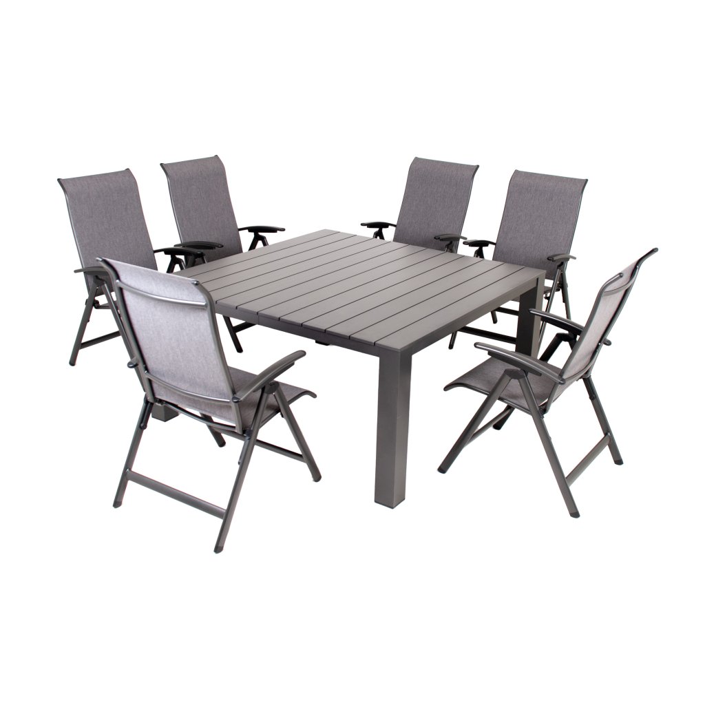Prato Yelmo Alu to praktyczny i bezobsługowy zestaw ogrodowy, który pomieści całą rodzinę. Posiada nowoczesny, czysty design, podkreślający naturalne piękno i wysoką funkcjonalność aluminium. Składa się z 6 regulowanych krzeseł ogrodowych i dużego aluminiowego stołu kwadratowego.