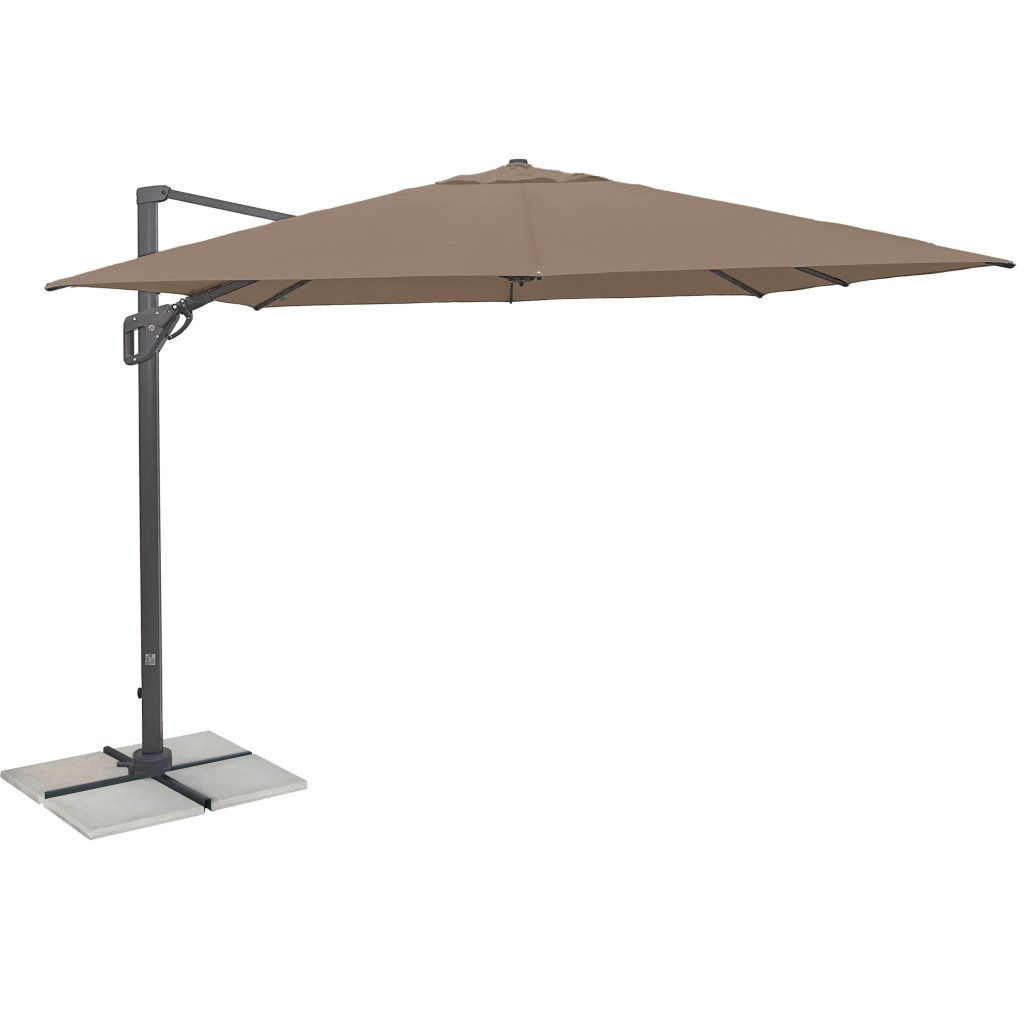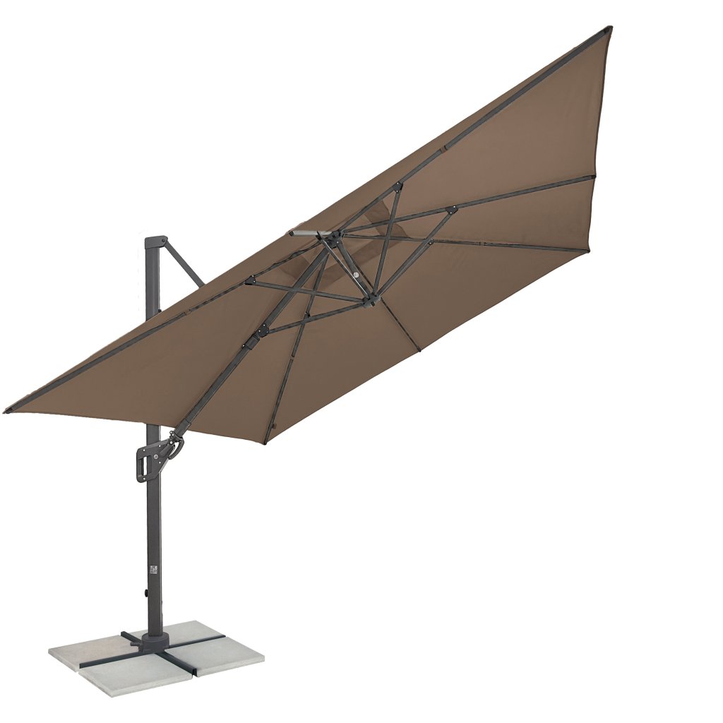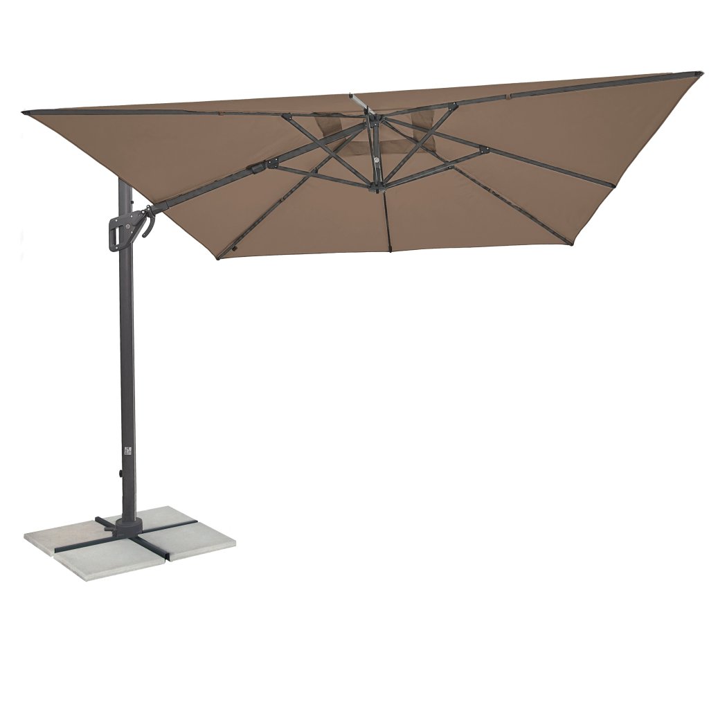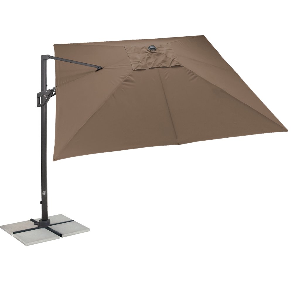 Parasol z aluminiową konstrukcją, posiadający elegancki i komfortowy mechanizm dla łatwiejszej obsługi. Pokrowiec wykonany jest z tkaniny poliestrowej i jest wodoodporny, ma bardzo dobrą ochronę przed promieniowaniem UV SPF 50+. Stojak jest częścią parasola (bez płyt 50 x 50 x 4 cm). Parasol jest obrotowy o 360° i można go przechylać wzdłuż głównego drążka, co pozwala na zacienienie przez cały dzień zgodnie z potrzebami.