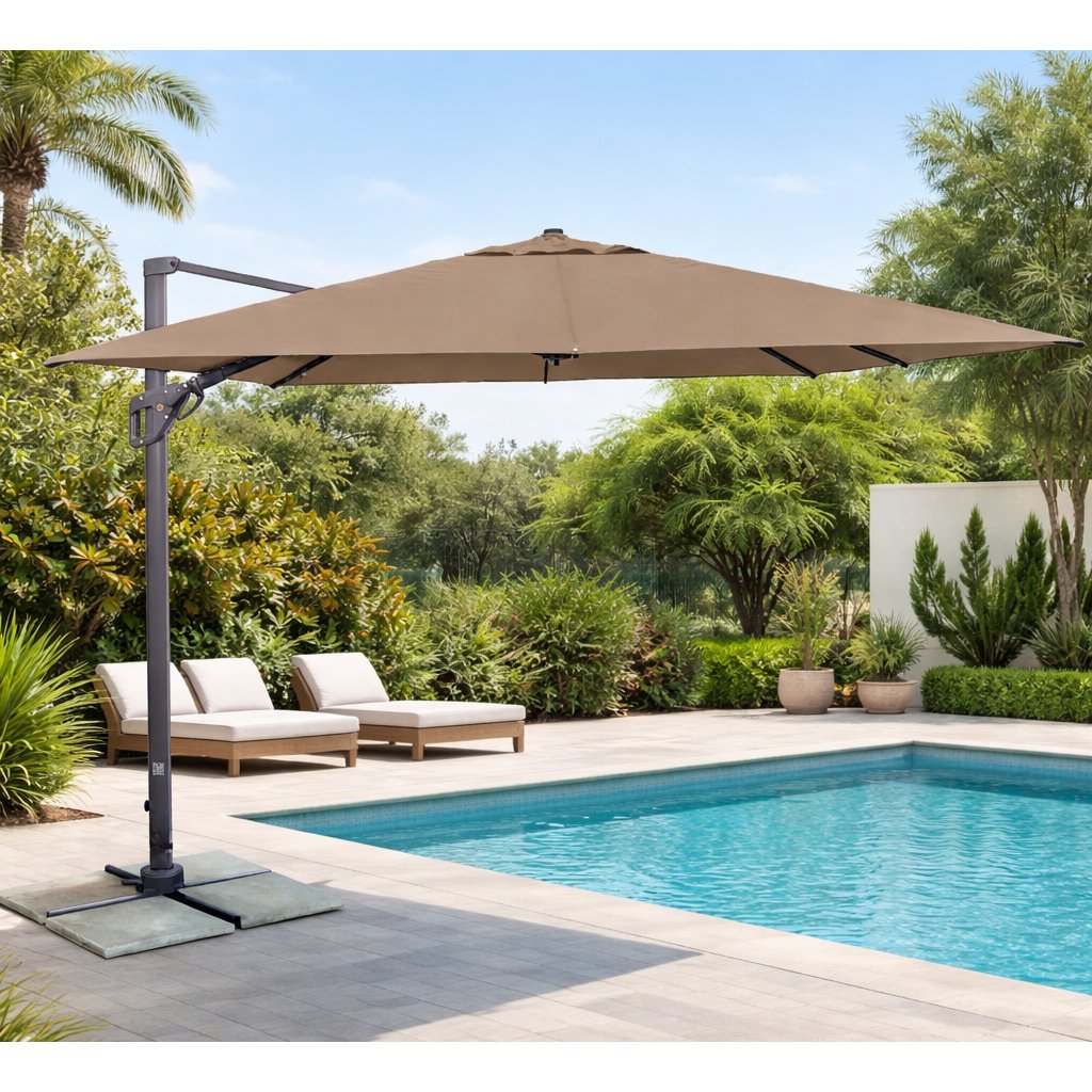Parasol z aluminiową konstrukcją, posiadający elegancki i komfortowy mechanizm dla łatwiejszej obsługi. Pokrycie wykonane jest z tkaniny poliestrowej i jest wodoodporne, zapewnia bardzo dobrą ochronę przed promieniowaniem UV SPF 50+. Stojak jest częścią parasola (bez płyt 50 x 50 x 4 cm). Parasol jest obrotowy o 360° i można go przechylać wzdłuż głównego drążka, co pozwala na zacienienie przez cały dzień zgodnie z potrzebami.