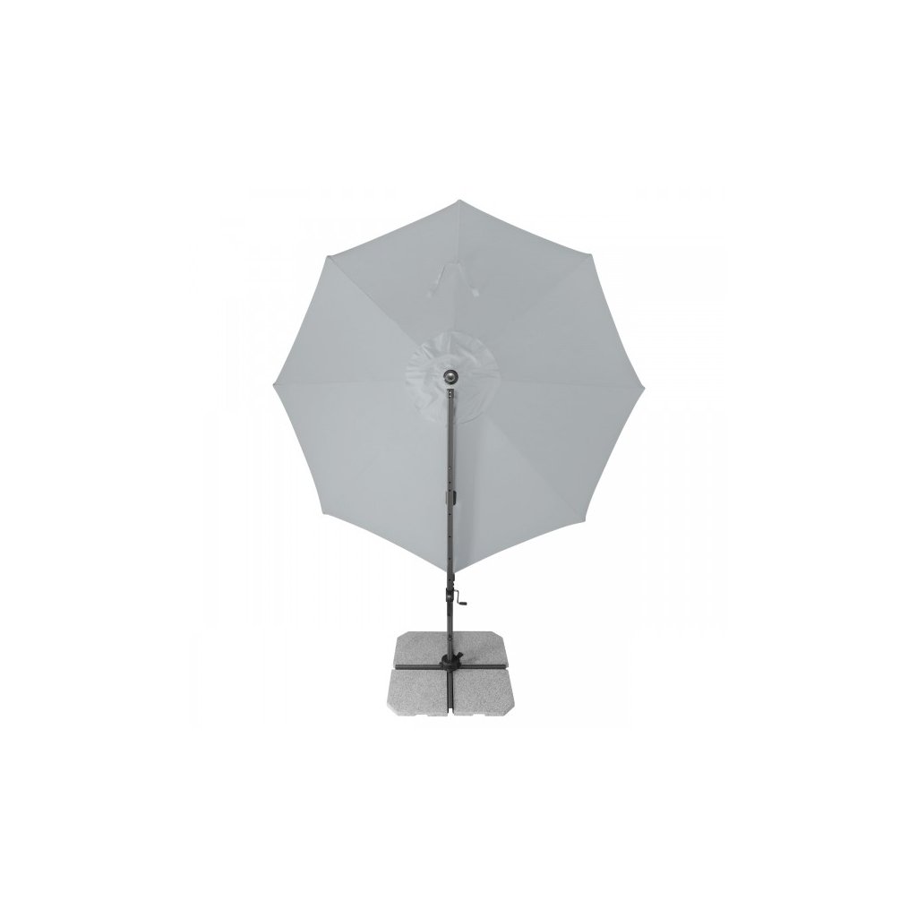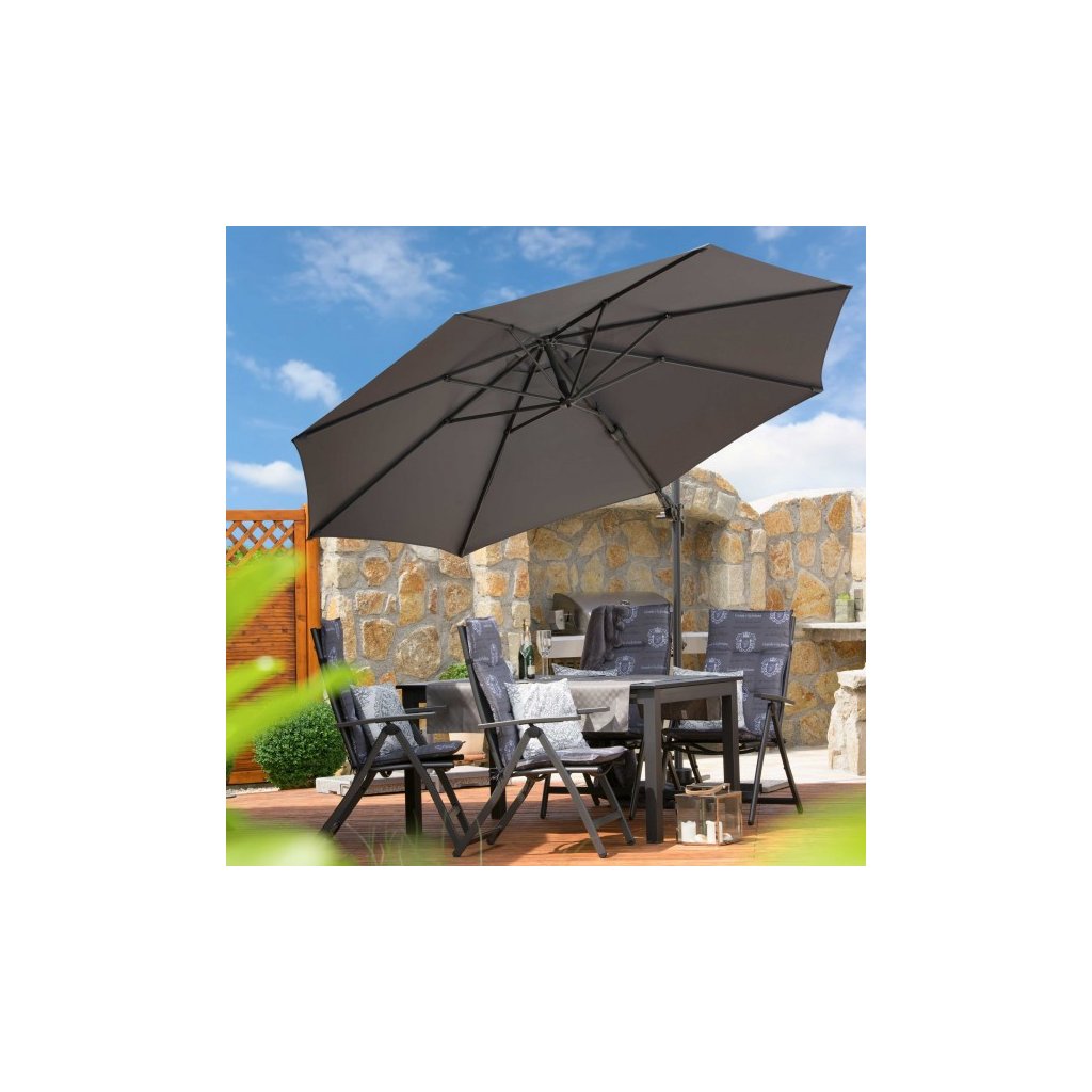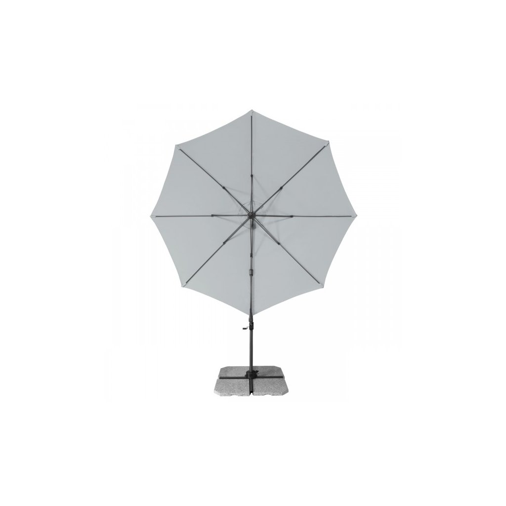 Funkcjonalny parasol jest wyposażony w mechanizm korbowy i jest łatwy w obsłudze. Pokrowiec parasola wykonany jest z tkaniny poliestrowej, jest wodoodporny i posiada dobrą ochronę UV SPF 50+. Parasol można obracać o 360°, można go pochylać w siedmiu pozycjach i obracać osiowo w obie strony. Parasol jest dostarczany ze stojakiem na 4 płyty 50x50x4 cm (bez płyt 50x50x4 cm).