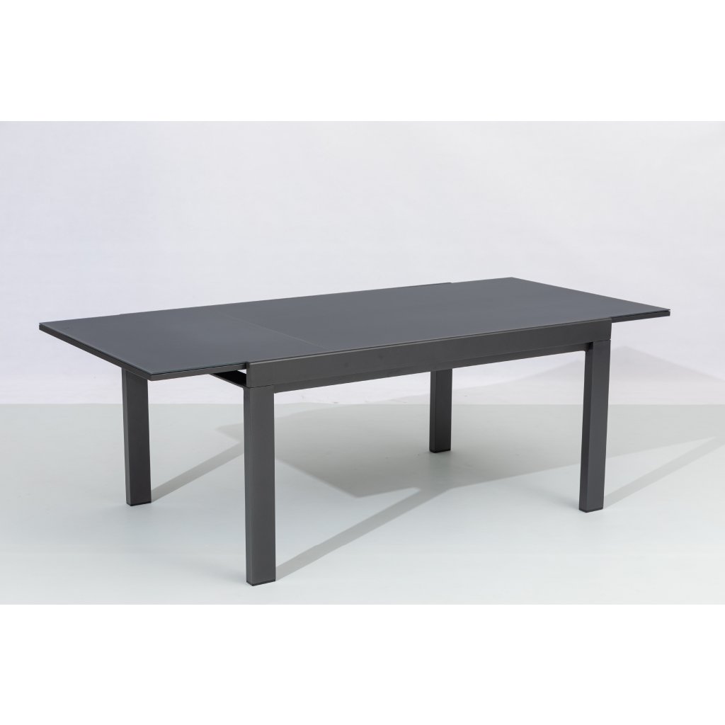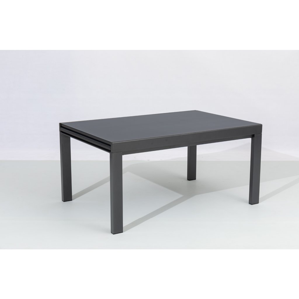 Stół ma blat ze strukturalnego szkła. Blat uzupełnia wytrzymała aluminiowa konstrukcja gwarantująca długą żywotność.