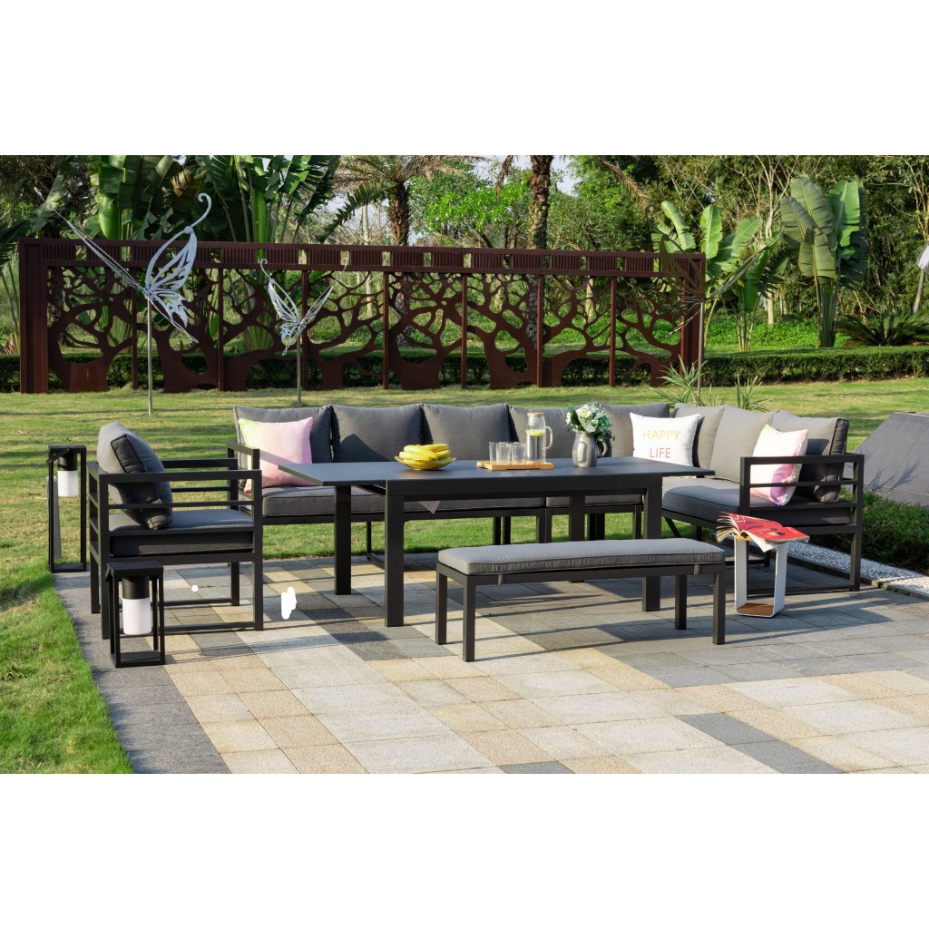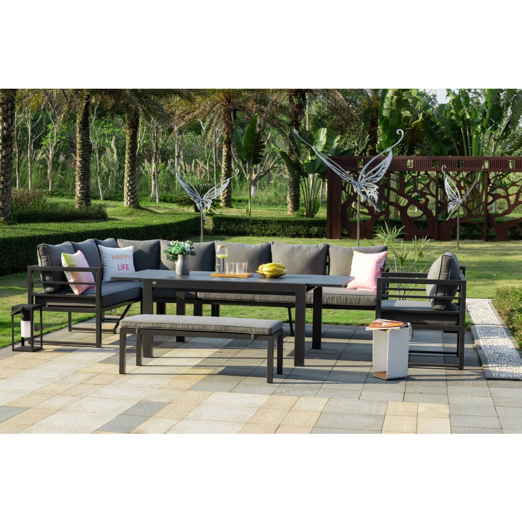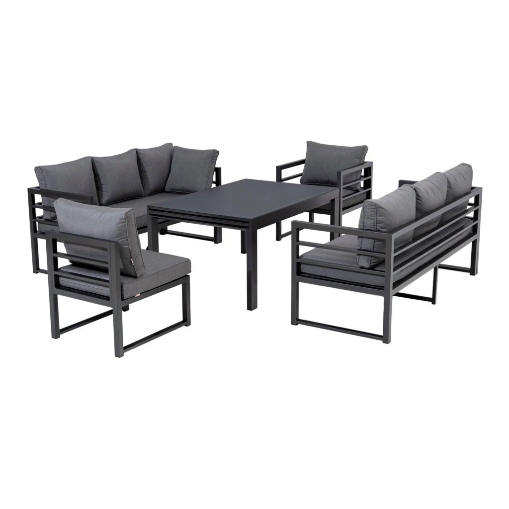Luksusowy zestaw ogrodowy, który może być na zewnątrz przez cały rok. Konstrukcja wykonana jest z lekkiego, wytrzymałego i bezobsługowego aluminium. Zestaw zawiera 2 x 3-osobową sofę, 1 x fotel, 1 x ławkę, 1 x rozkładany stół. W zestawie znajdują się szare, puszyste poduszki, pokrowce są zdejmowane (można je prać) i wykonane są z wytrzymałej tkaniny LIKA-TEX®.