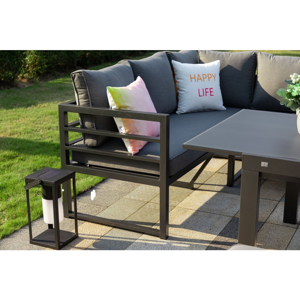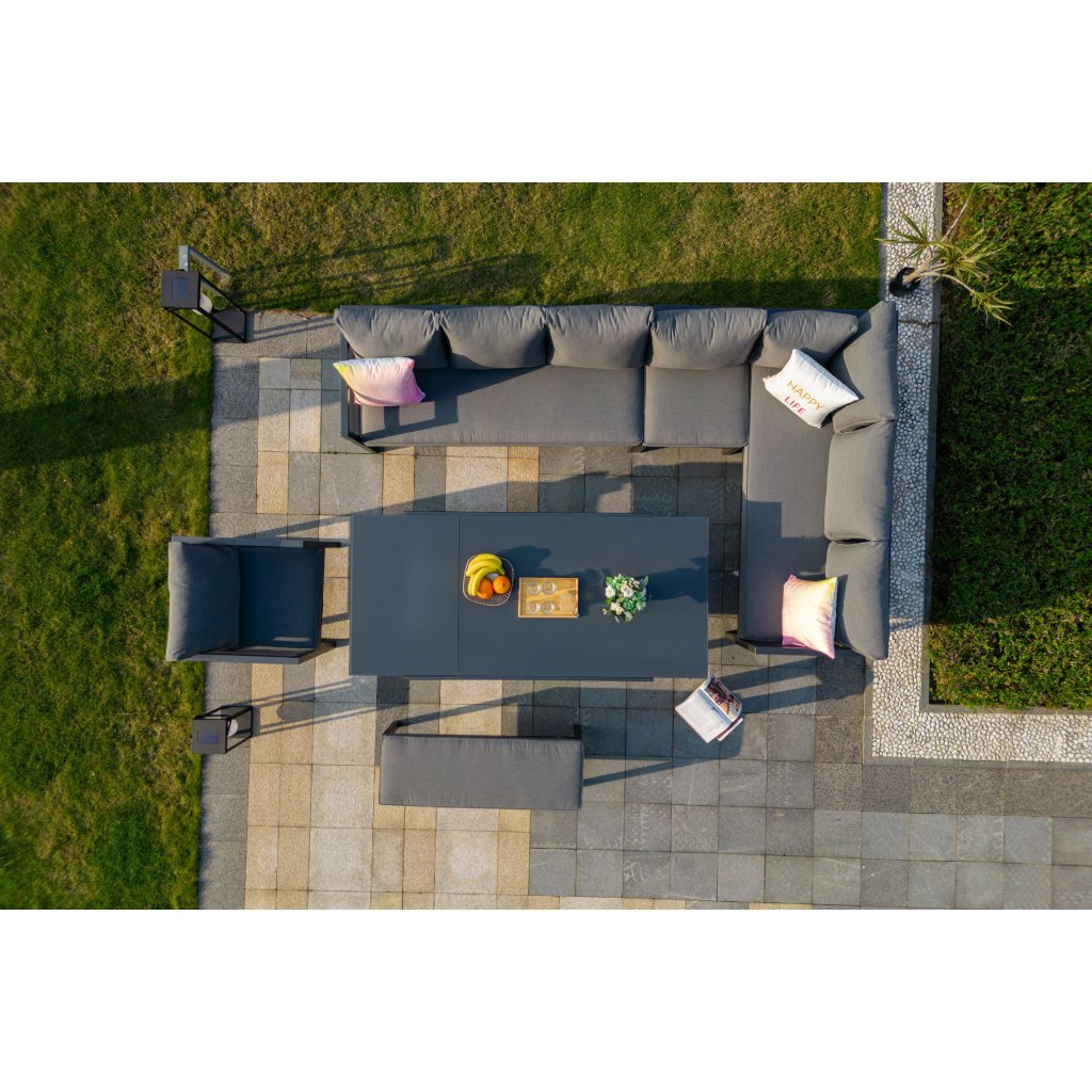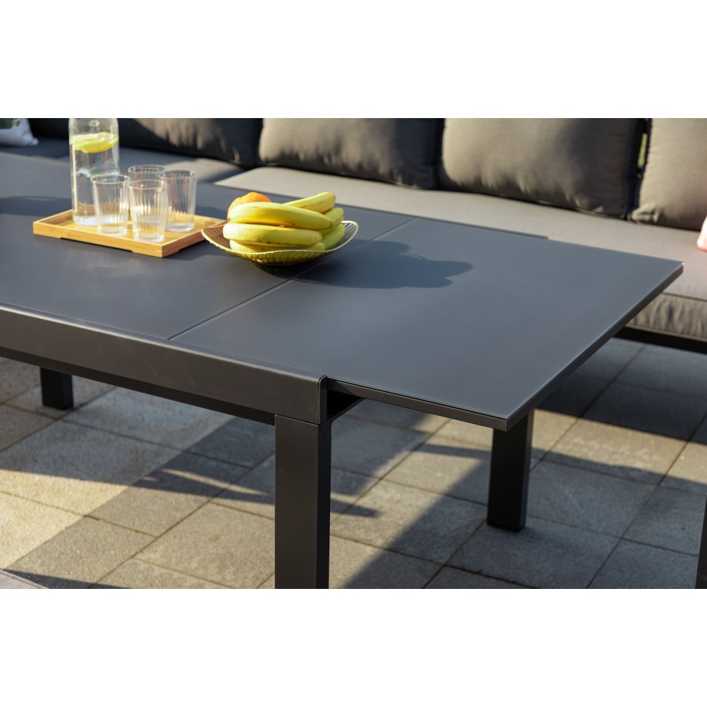 Luksusowy zestaw ogrodowy, który może być na zewnątrz przez cały rok. Konstrukcja wykonana jest z lekkiego, wytrzymałego i bezobsługowego aluminium. Zestaw zawiera 2 x 3-osobową sofę, 1 x fotel, 1 x ławkę, 1 x rozkładany stół. W zestawie znajdują się szare, puszyste poduszki, pokrowce są zdejmowane (można je prać) i wykonane są z wytrzymałej tkaniny LIKA-TEX®.
