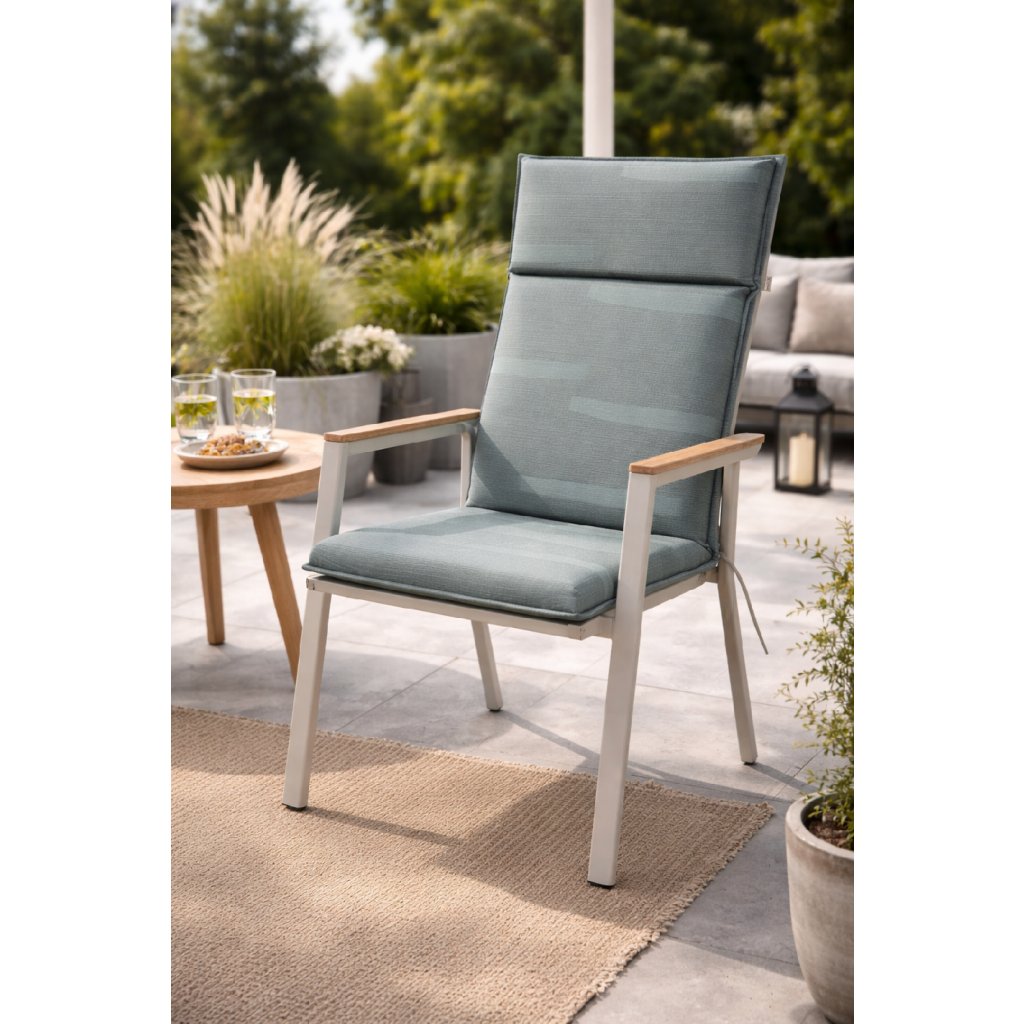 Poduszka z niskim oparciem do mebli ogrodowych z serii SIERRA jest w wersji z obszytym brzegiem, pikowana 1x w oparciu. Mocowanie odbywa się za pomocą przesuwnego klipsa. Dzięki klipsowi można dopasować rozmiar do wymiarów i rodzaju krzesła, klips jest mocny i się nie rozciąga. Mocowanie siedziska odbywa się za pomocą dwóch sznurków w zgięciu poduszki. Pokrowiec jest zabezpieczony specjalną impregnacją zapobiegającą pleśni i brudowi.Dzięki tej impregnacji zanieczyszczenia pozostają na powierzchni impregnacji i nie przedostają się do poszczególnych włókien pokrowca, dzięki czemu tkanina łatwo się czyści tylko wilgotną ściereczką lub gąbką a poduszka jest bardziej odporna na wilgoć. Uwaga, poduszka nie jest wodoodporna. Wersja nadaje się również do trudnych warunków kawiarni, ogródków i restauracji. Pokrowiec jest nieusuwalny.