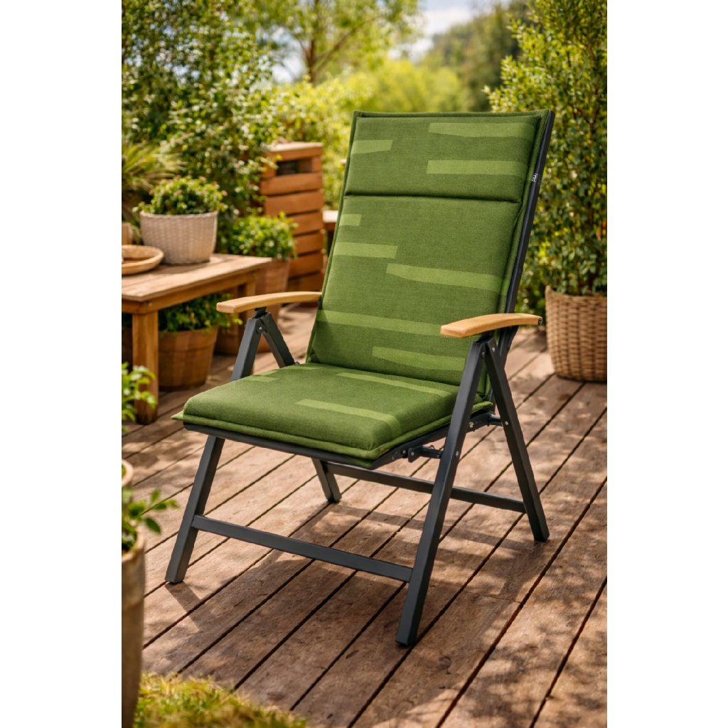 Poduszka z wysokim oparciem do mebli ogrodowych z serii SIERRA jest w wersji z obszytym brzegiem, przeszyta 1x w oparciu. Mocowanie odbywa się za pomocą przesuwnego klipsa. Dzięki klipsowi można dopasować rozmiar do wymiarów i rodzaju krzesła, klips jest mocny i się nie rozciąga. Mocowanie siedziska odbywa się za pomocą dwóch sznurków w zgięciu poduszki. Pokrowiec jest poddany specjalnej impregnacji zapobiegającej pleśni i brudowi. Dzięki tej impregnacji zanieczyszczenia pozostają na powierzchni impregnacji i nie wnikają w poszczególne włókna pokrowca, dzięki czemu tkanina łatwo się czyści tylko wilgotną ściereczką lub gąbką i poduszka jest bardziej odporna na wilgoć. Uwaga, poduszka nie jest wodoodporna. Wersja nadaje się również do trudnych warunków kawiarni, ogródków i restauracji. Pokrowiec jest nieściągalny.