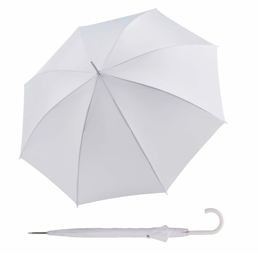 Damski parasol ślubny typu haczyk z automatycznym otwieraniem. Bardzo wysokiej jakości konstrukcja stalowa, mocna, wiatroodporna stalowa konstrukcja w kolorze srebrnym pasującym do białego pokrowca parasola. Duża czasza. Poliester jest odporny na zmiany wilgotności i temperatury, nie kurczy się.
