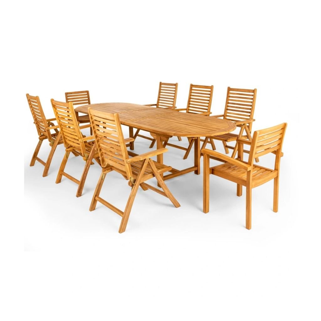 Nowoczesny zestaw z drewna tekowego sprawdzi się u wszystkich, którzy chcą zamienić swój ogród lub taras w strefę wypoczynku i relaksu. Zestaw składa się z 6 rozkładanych krzeseł, 2 krzeseł sztaplowanych oraz owalnego, dużego stołu z drewna tekowego z możliwością rozłożenia. Jest to niezwykle wytrzymałe, bardzo trwałe i solidne. Krzesła można sztaplować jedno na drugim lub łatwo rozkładać i składać, dzięki czemu oszczędzają miejsce potrzebne do przechowywania. Przy stole można usadzić nawet liczne grono gości.