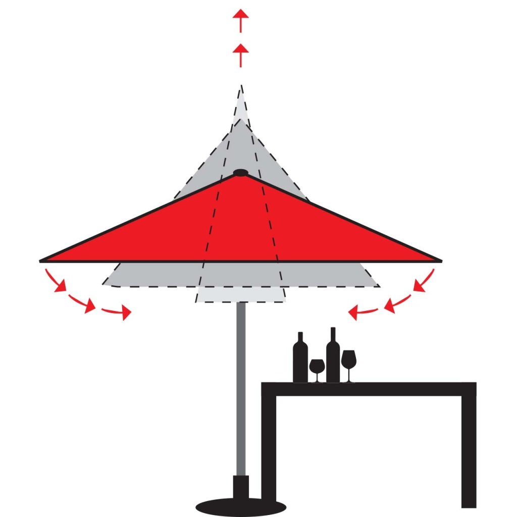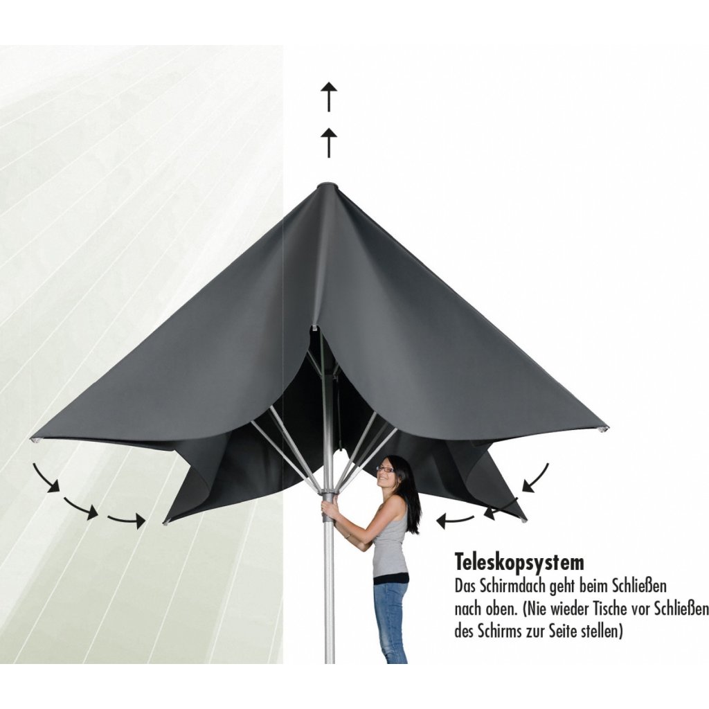 - konstrukcja podczas otwierania i zamykania wysuwa się do góry, dzięki czemu nie trzeba przesuwać mebli (jeśli parasol znajduje się przy meblach)