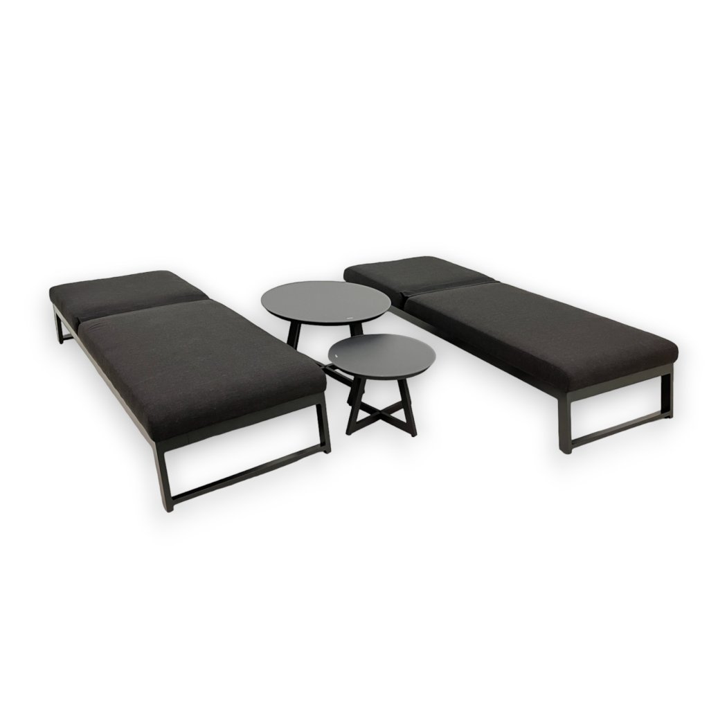 Zestaw zawiera dwa eleganckie stoliki ogrodowe Tiso z aluminiową konstrukcją i szklanym blatem o strukturze plastra miodu. Dzięki kompaktowym wymiarom i niskiej wadze możesz je łatwo przenosić w dowolne miejsce. Stanowią idealne uzupełnienie leżaka Melia, ale można ich również używać samodzielnie.