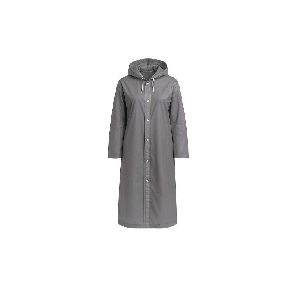 Uniwersalny płaszcz przeciwdeszczowy dla dorosłych w kolorze szarym, z kapturem i zatrzaskami. Płaszcz przeciwdeszczowy jest kompaktowy i nadaje się na wycieczki oraz do codziennego noszenia w mieście.