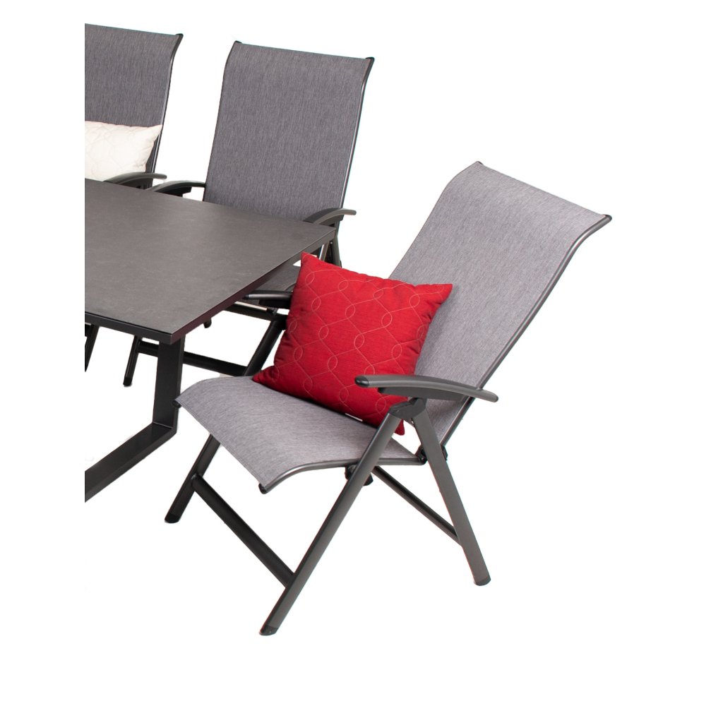 Regulowane krzesło ogrodowe YELMO ALU wykonane jest z materiałów niewymagających konserwacji. Stabilna aluminiowa konstrukcja w kolorze antracytowym jest uzupełniona splotem z wysokiej jakości sztucznej tkaniny w kolorze melanżowo-szarym. 10-stopniowy system regulacji oparcia zapewni maksymalny komfortowy odpoczynek. Wszystko uzupełniają stabilne aluminiowe podłokietniki.