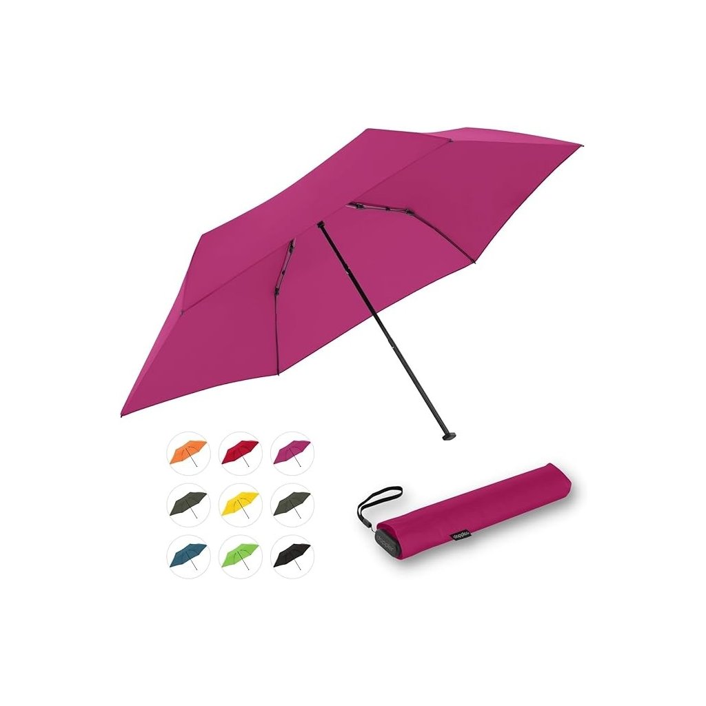 Stylowy, kieszonkowy, ultralekki parasol w wielu wersjach kolorystycznych. Dzięki wadze zaledwie 99 gramów (lżejszy niż tabliczka czekolady) jest najlżejszym parasolem doppler. Dzięki kompaktowym wymiarom (długość złożonego parasola to 21 cm) i płaskiemu kształtowi bez problemu schowasz go do każdej torebki lub marynarki. Ramiona z aluminium i karbonu. Pokrowiec jest ze 100% wytrzymałego poliestru.
