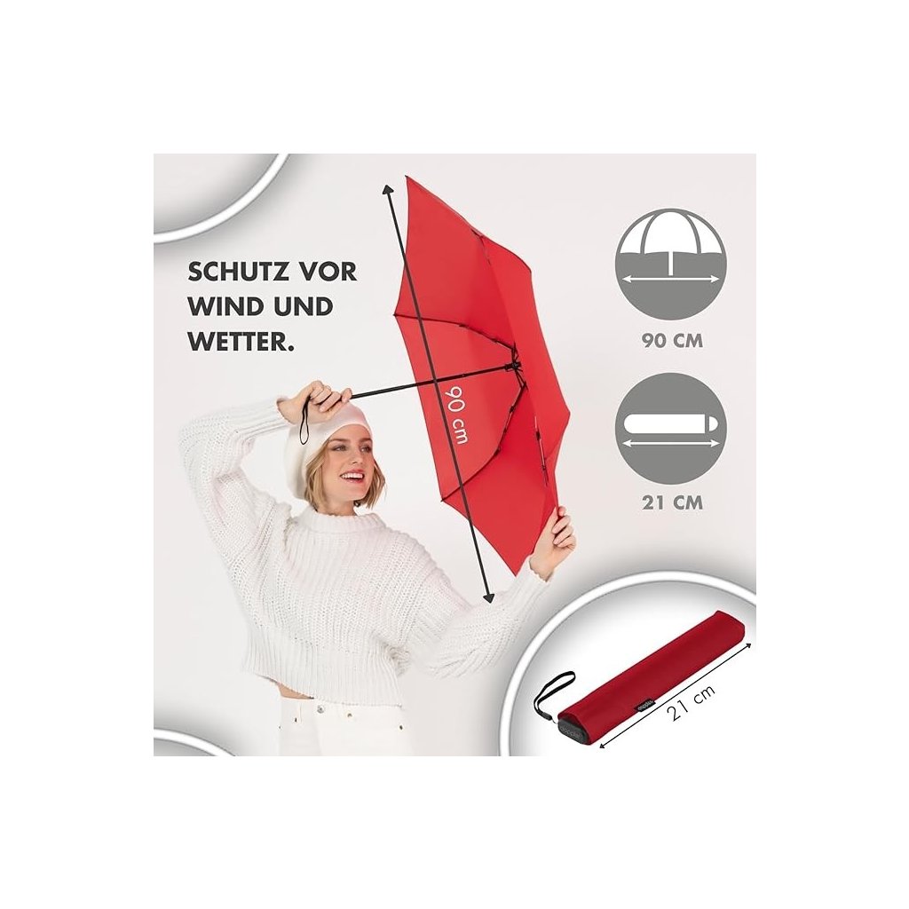 Stylowy, kieszonkowy, ultralekki parasol w wielu wersjach kolorystycznych. Dzięki wadze zaledwie 99 gramów (lżejszy niż tabliczka czekolady) jest najlżejszym parasolem doppler. Dzięki kompaktowym wymiarom (długość złożonego parasola to 21 cm) i płaskiemu kształtowi bez problemu schowasz go do każdej torebki lub marynarki. Ramiona z aluminium i karbonu. Pokrowiec jest ze 100% wytrzymałego poliestru.